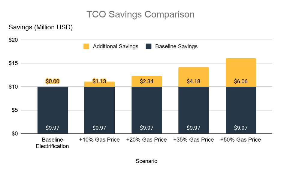 To isolate the exact impact of fuel volatility, the analysis holds all other variables constant, including electricity rates. Because the electric baseline remains stable, the total percentage of savings accelerates faster than the price of fuel itself. This shows that fleets can not only accrue substantial savings by adding EVs into the mix, they can also protect themselves from fuel price inflation. This demonstrates that electric vehicles in a fleet can function as a financial hedge, performing better as the fuel market worsens. In a severe shock scenario (+50% fuel increase), this savings multiplier transforms the $9.97M baseline into a staggering $16.03M in TCO savings—a 60% jump.